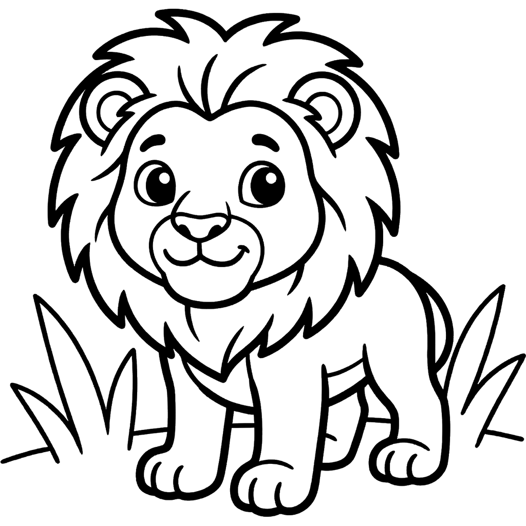 En charmerende og venlig løveunge står opmærksomt i et område med højt græs, dens bløde manke og hale klar til at blive bragt til live med farver. Den unge store kat har et sødt smil og fængslende store øjne, der inviterer til kreativitet.