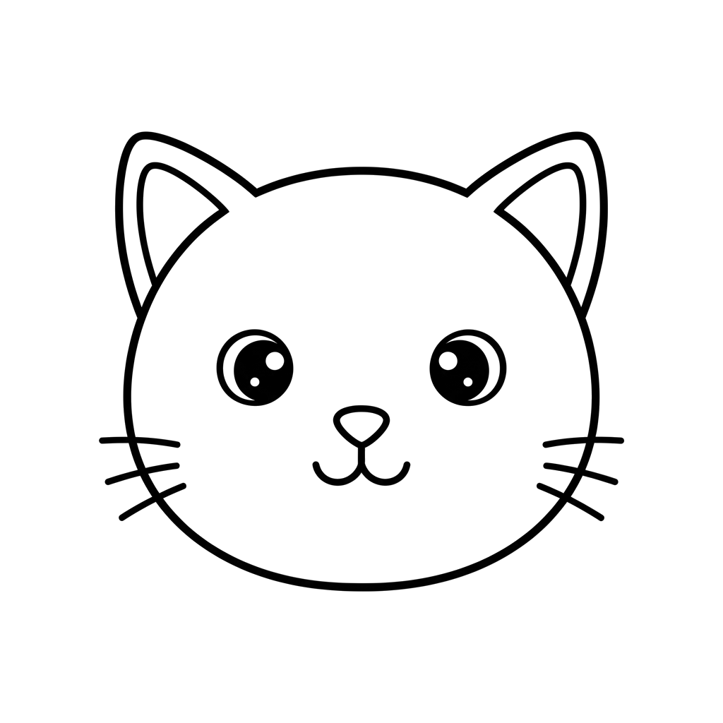 En charmerende og enkel tegning af et kattehoved med store, udtryksfulde øjne og knurhår, perfekt for unge kunstnere at personliggøre med farver. Dette yndige katteansigt er afbildet i en ren, minimalistisk stil.