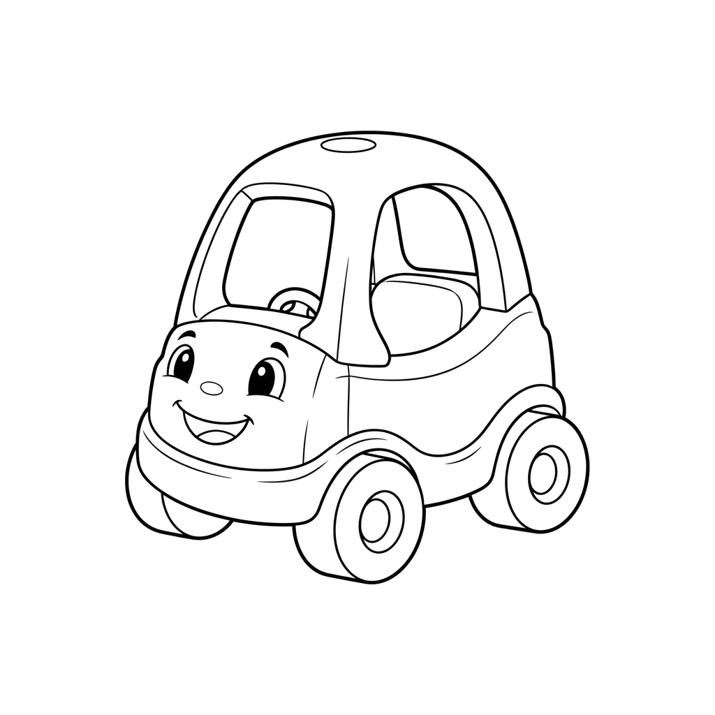 En glad, enkel legetøjsbil med et venligt smilende ansigt, klar til at et barn kan farvelægge. Dette søde køretøj har et åbent tag og et klassisk design, perfekt til fantasifuld leg.