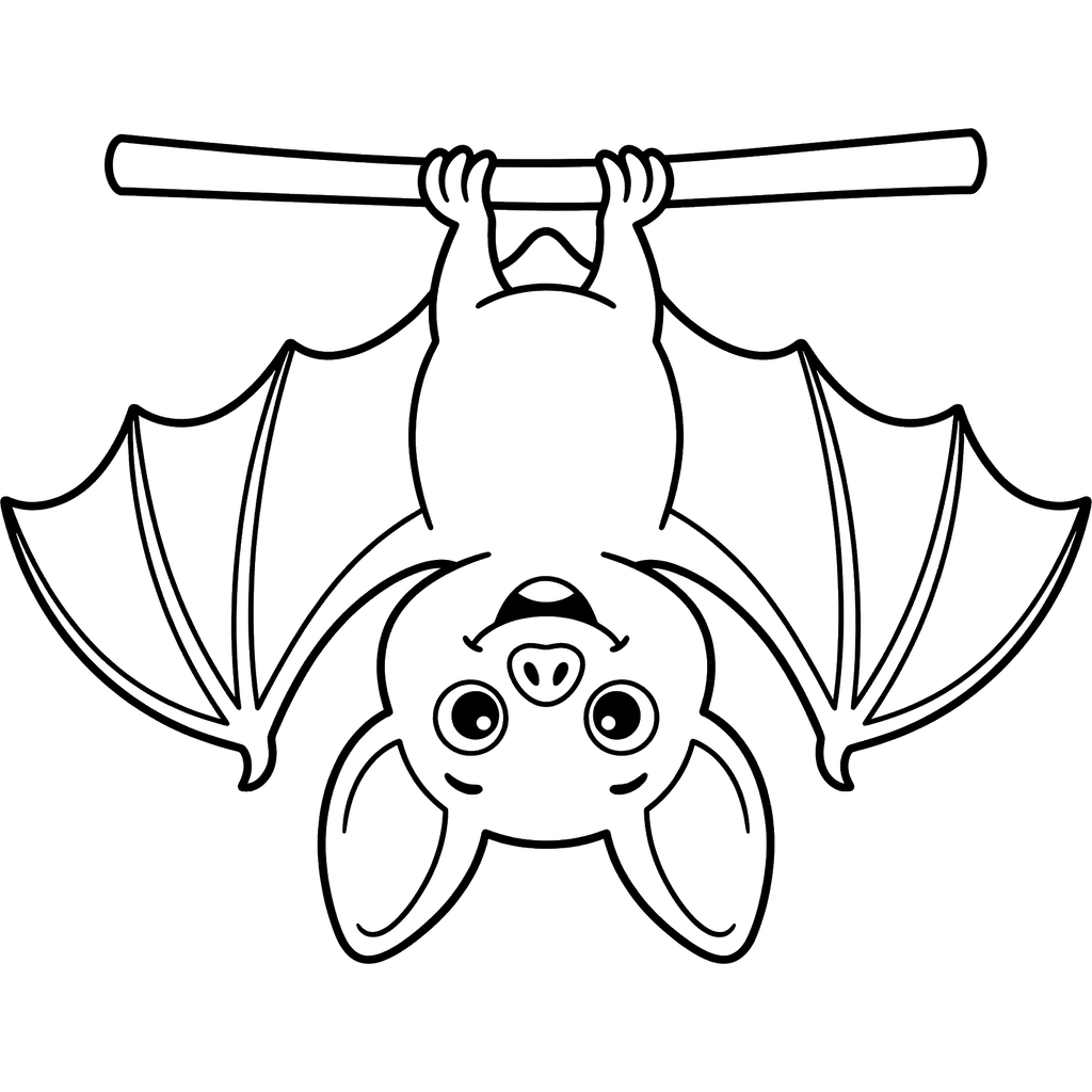En glad, sød flagermus hænger på hovedet fra en trægren, klar til et sjovt farvelægningseventyr. Dens store øjne og åbne mund giver den et venligt udtryk.