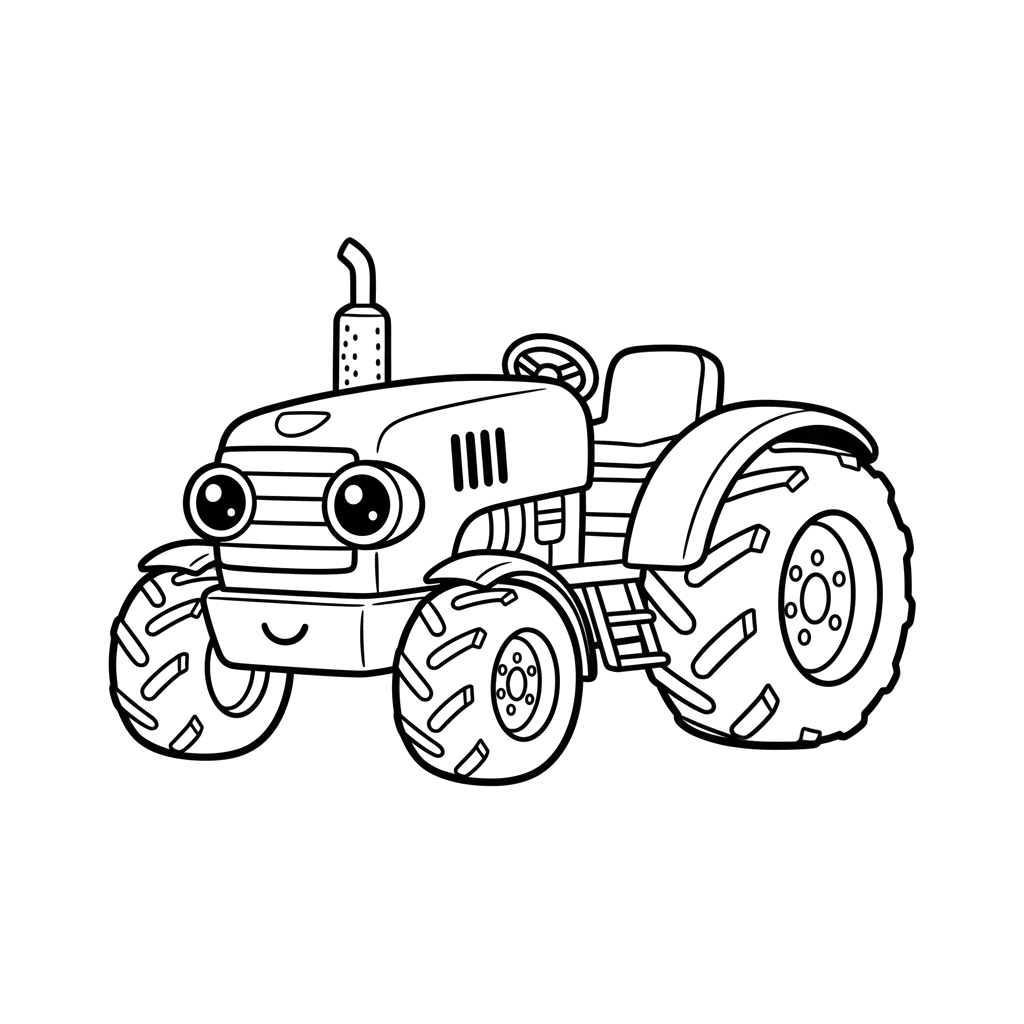 Ein freundlicher Bauernhoftraktor mit großen, runden Augen und einem sanften Lächeln, bereit für Kinder, ihn mit Farbe zum Leben zu erwecken. Dieses fröhliche Landwirtschaftsfahrzeug ist perfekt für junge Fans des Bauernhoflebens und der Maschinen.