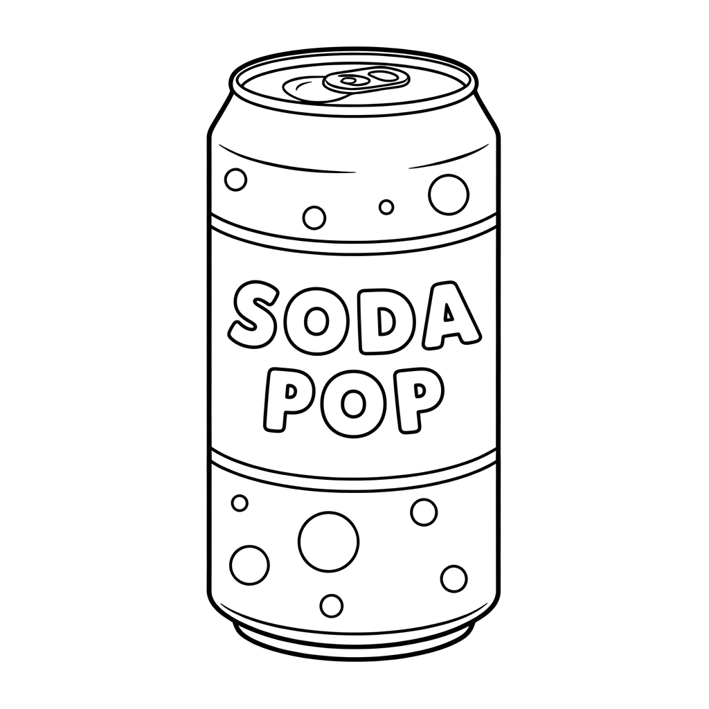 Dieses Bild zeigt eine einfache, kräftige Zeichnung einer Getränkedose, deutlich beschriftet mit "SODA POP". Es ist perfekt für alle, die süße, sprudelnde Getränke mögen und ihnen ihren eigenen Farbtupfer verleihen möchten.
