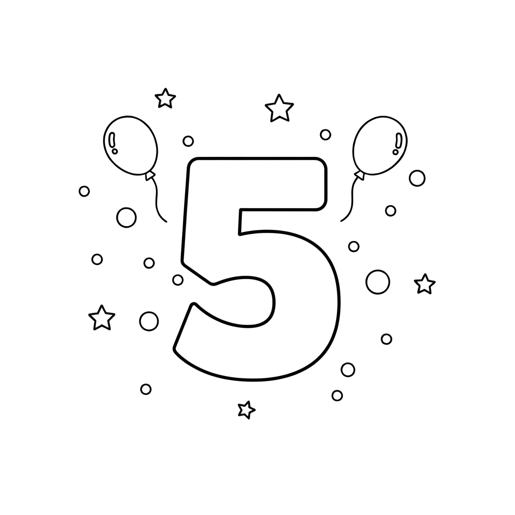 Ein fröhliches Design mit der fetten Zahl Fünf, umgeben von festlichen Luftballons, Sternen und konfettiartigen Kreisen, perfekt für die Feier eines 5. Geburtstages oder eines besonderen Meilensteins.