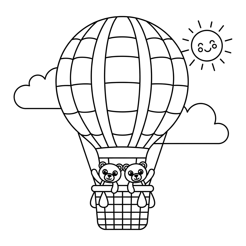 Zwei fröhliche Teddybären genießen eine wunderschöne Fahrt in einem Heißluftballon, schwebend zwischen Wolken unter einer lächelnden Sonne. Diese herzerwärmende Szene ist perfekt für eine entspannende Aktivität.