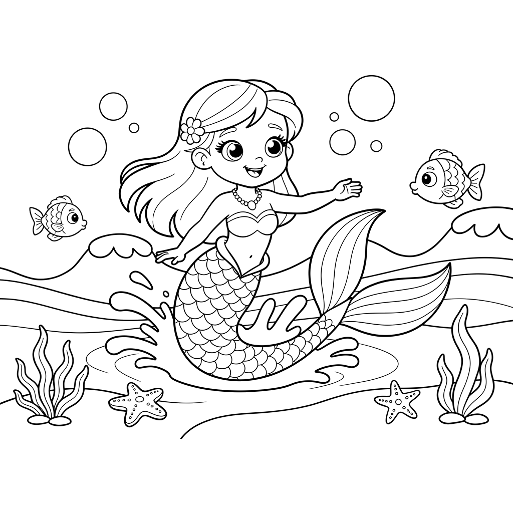 Eine fröhliche Meerjungfrau spielt vergnügt im Ozean mit ihren Fischfreunden, umgeben von Seesternen und wiegendem Seegras. Sie hat eine Blume im Haar und eine hübsche Perlenkette.