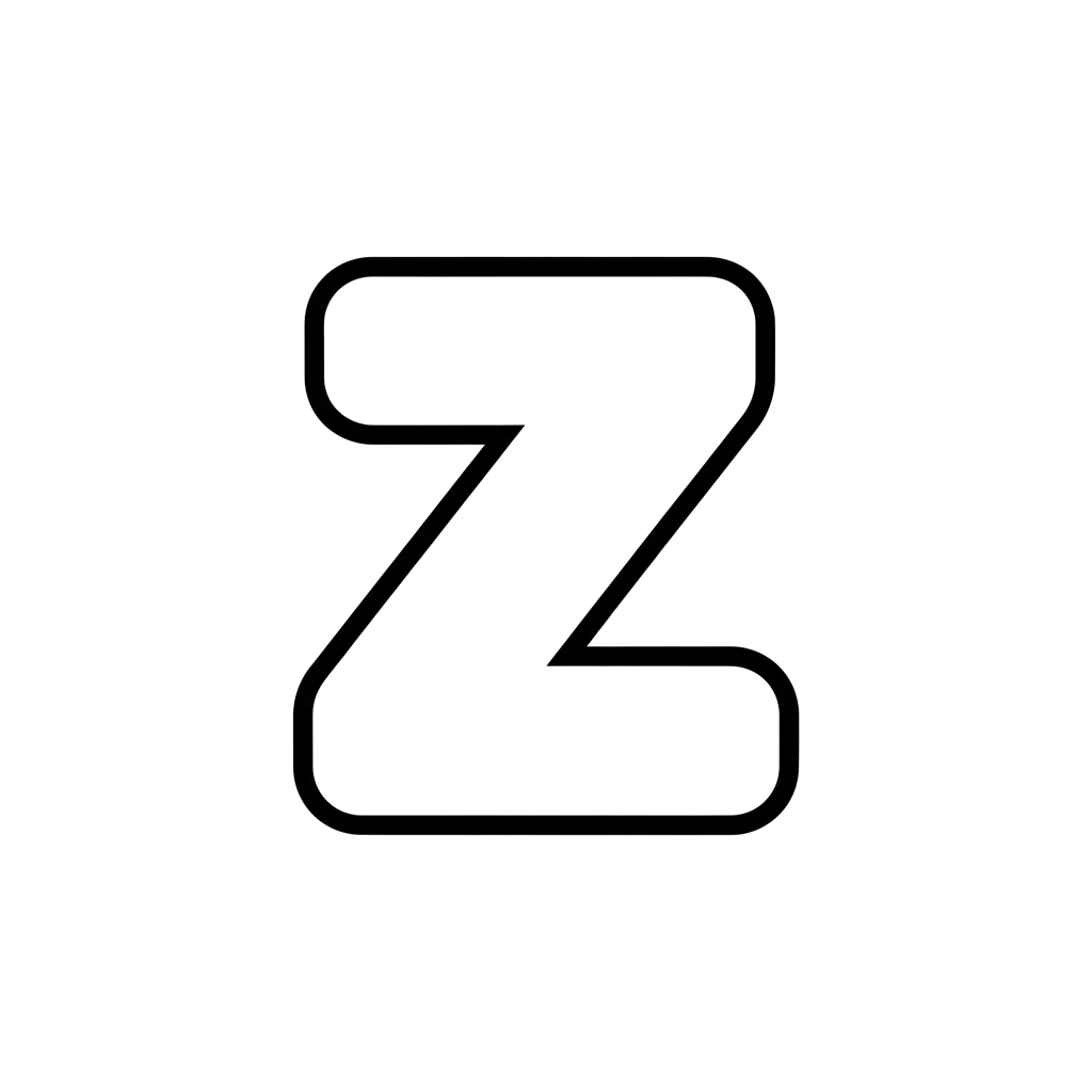 Eine einfache schwarze Umrisszeichnung des Großbuchstabens Z, mit abgerundeten Ecken für ein weiches, freundliches Aussehen. Dieses Design ist perfekt zum Erlernen des Alphabets oder für kreative Projekte.