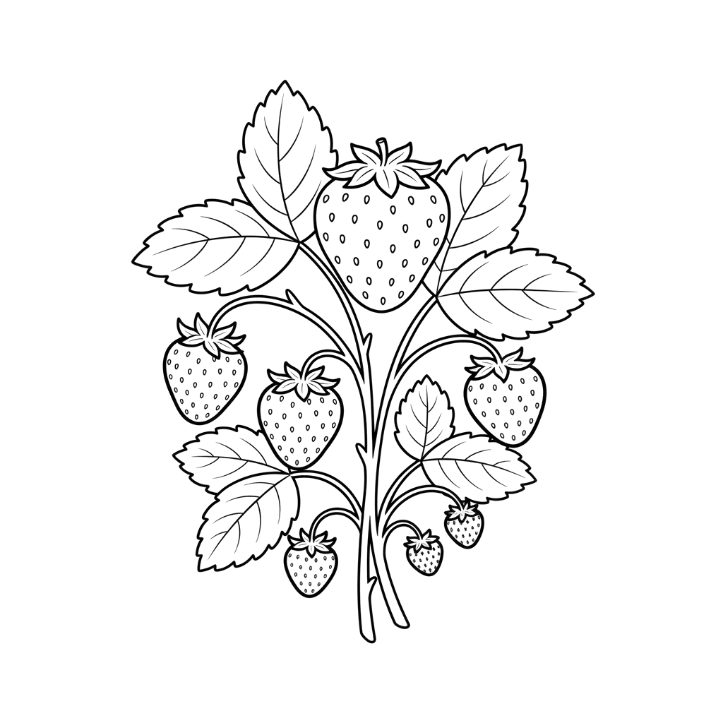 Eine charmante Umrisszeichnung einer Erdbeerpflanze, die mehrere köstliche Beeren zwischen ihren breiten Blättern zeigt. Dieses entzückende Bild ist perfekt für jeden, der frisches Obst und die Natur liebt.