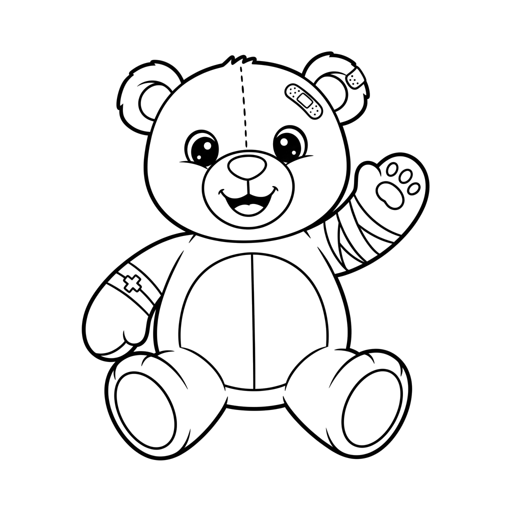 Ein freundlicher Teddybär, komplett mit Verbänden und einem fröhlichen Lächeln, sitzt bereit für Trost oder Spiel und winkt mit einer Pfote.