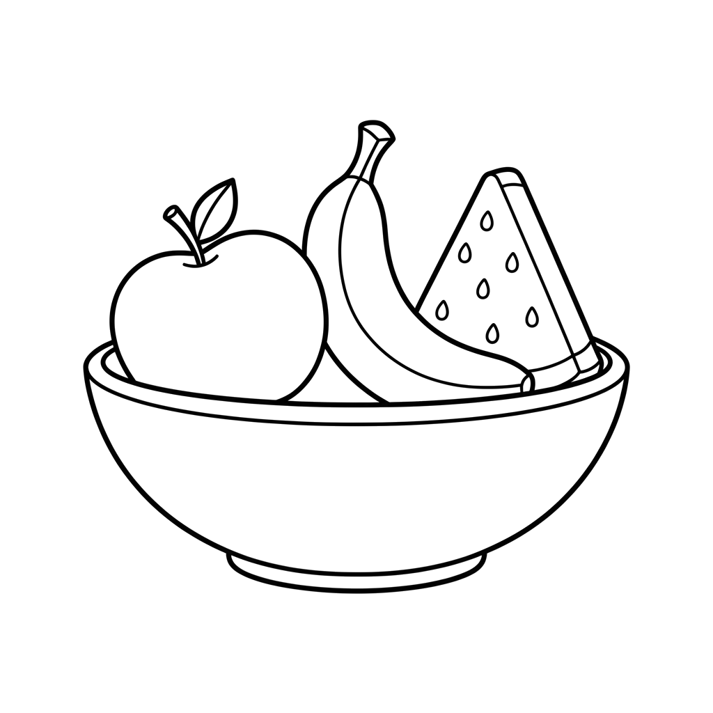 Dieses Bild zeigt eine entzückende Schale voller frischer Früchte, darunter ein knackiger Apfel, eine reife Banane und eine erfrischende Scheibe Wassermelone, perfekt für einen gesunden Snack.