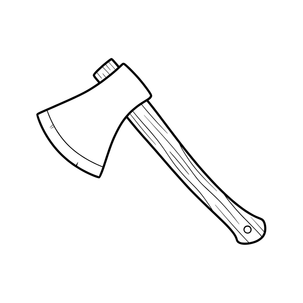 A straightforward black and white drawing features a classic axe, complete with a sturdy wooden handle and a sharp metal head.