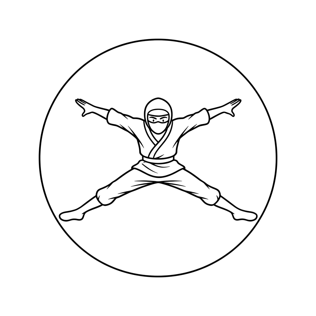 A stealthy ninja strikes an action pose, captured mid-jump with arms and legs extended inside a perfect circle. This dynamic image features a masked warrior showcasing agile movement.