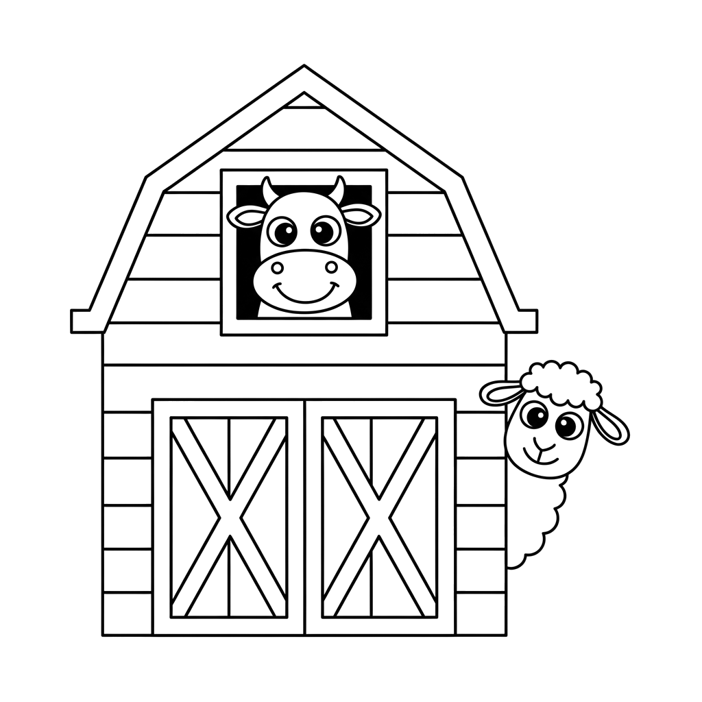 A friendly cow smiles from an upstairs barn window, while a fluffy sheep peeks playfully from behind the side of the barn. This charming farm scene features two happy animals ready for creative coloring.
