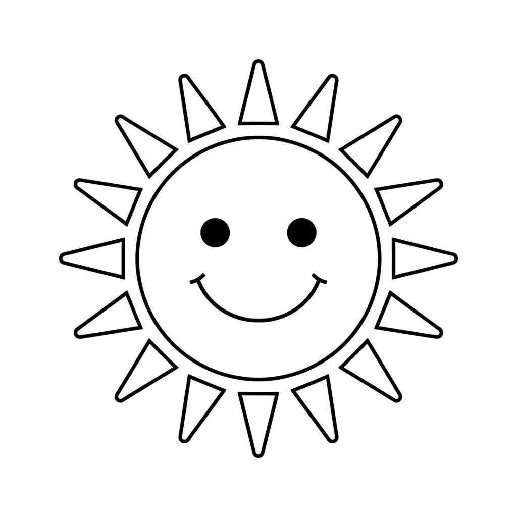 A cheerful sun character beams with a wide smile and bright eyes, radiating warmth and happiness. This friendly sun is perfect for kids to color and brighten their day.