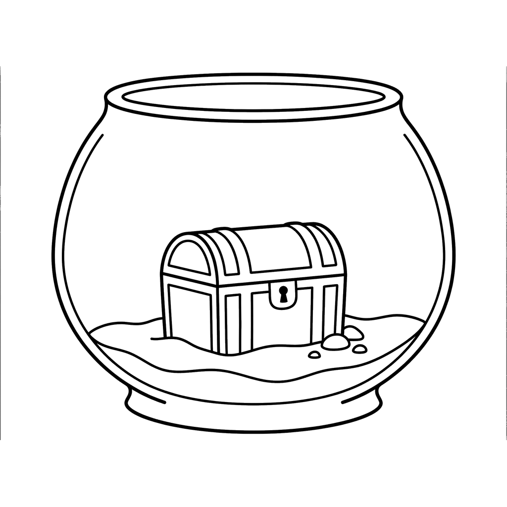 A charming image features a treasure chest resting on sand and small rocks inside a clear, round fishbowl, creating a miniature underwater scene. This delightful piece is perfect for an adventure-themed coloring activity.