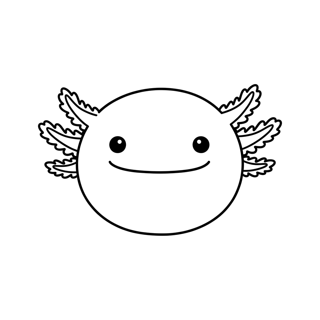 A friendly axolotl smiles sweetly, its round face and feathery gills ready for a splash of color. This adorable amphibian is eager to be brought to life with vibrant hues.