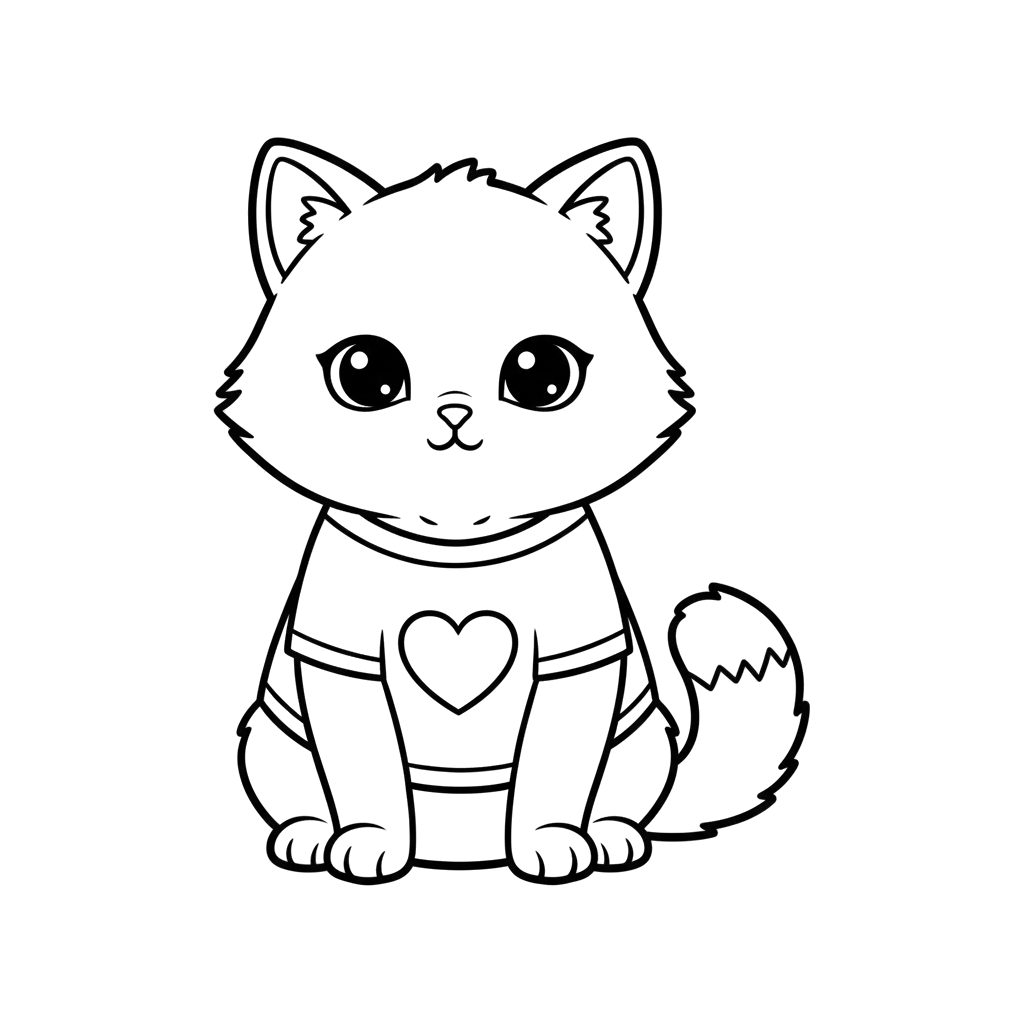 A sweet little cat with big, expressive eyes is ready for some color, wearing a charming shirt adorned with a heart. This adorable feline is perfect for a fun coloring activity.