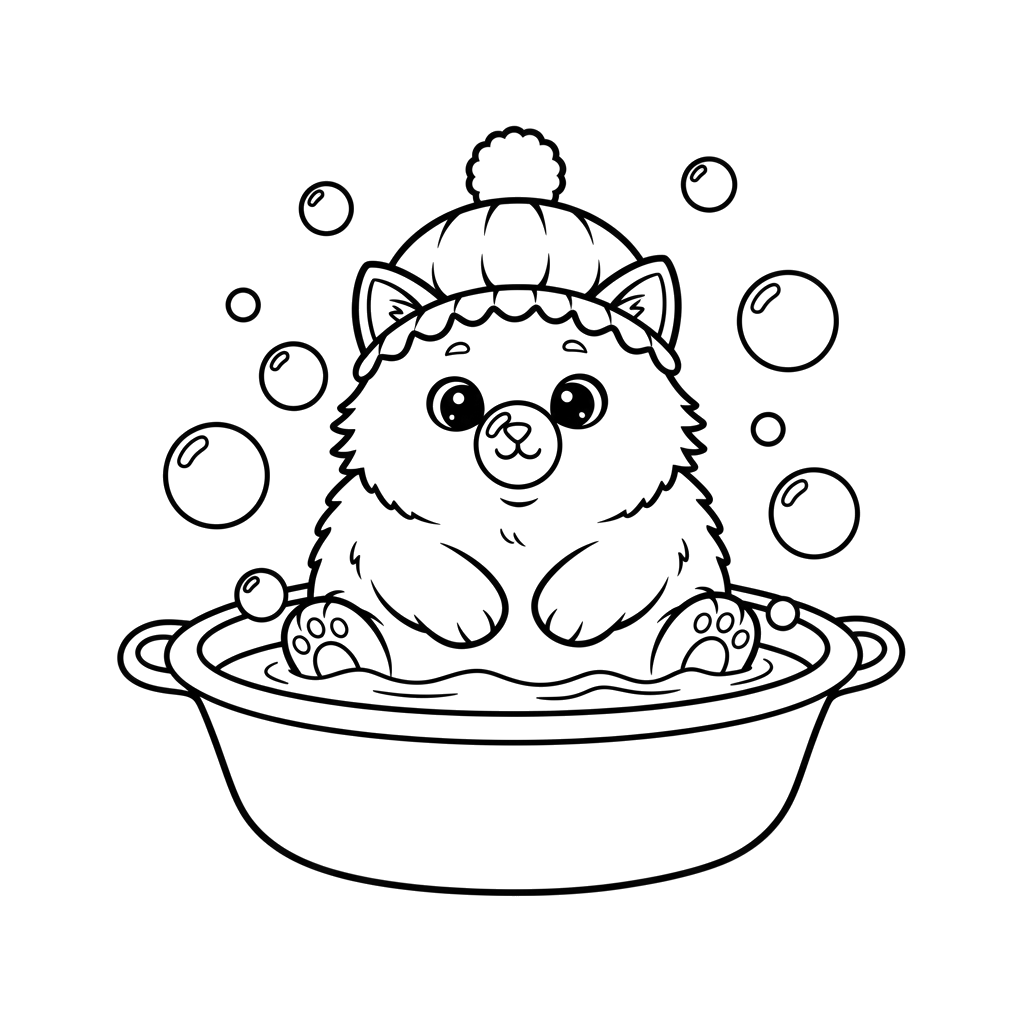 A cute, fluffy animal sits happily in a bathtub, wearing a cozy knitted hat and surrounded by playful bubbles. This adorable scene captures a fun and relaxing bath time moment.
