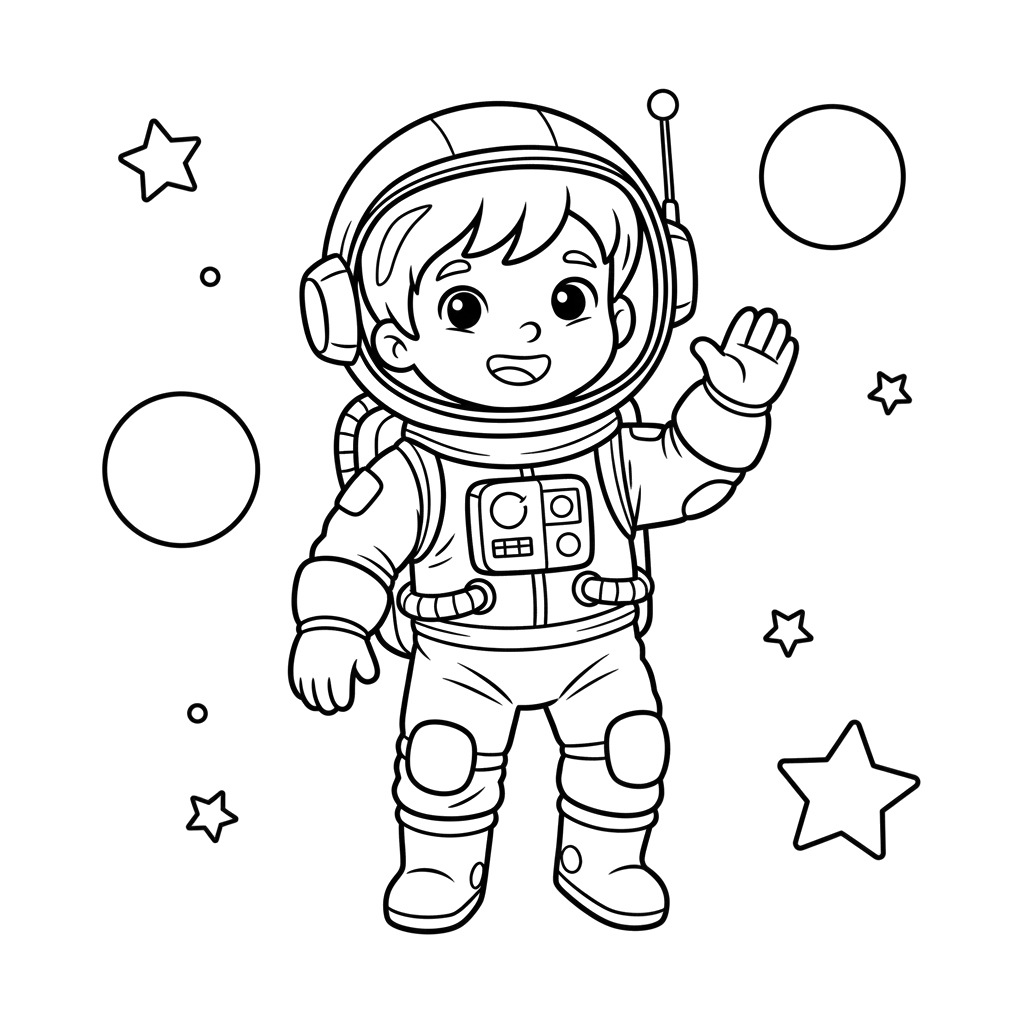 Un joven y feliz astronauta con traje espacial saluda con la mano mientras flota entre estrellas y planetas en el espacio exterior. Este simpático personaje invita a los niños a embarcarse en una aventura cósmica.
