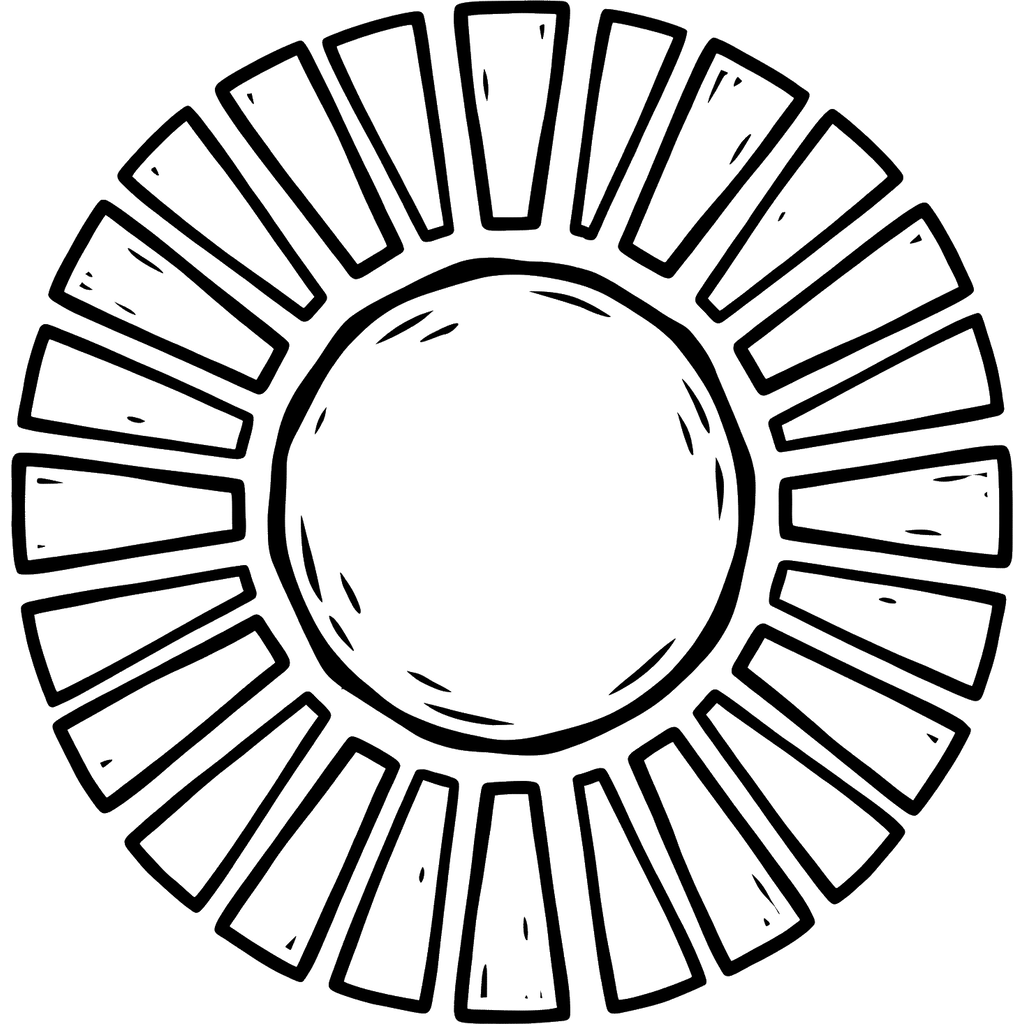Esta imagen presenta un sol simple y dibujado a mano con un centro circular y numerosos rayos estilizados que se irradian. Ofrece un diseño alegre perfecto para una experiencia de coloreado brillante.