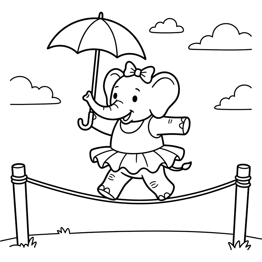 Un alegre elefante bebé con tutú y lazo se equilibra con gracia en una cuerda floja, sosteniendo un paraguas abierto mientras las nubes flotan en el cielo. Esta encantadora escena captura una actuación acrobática.