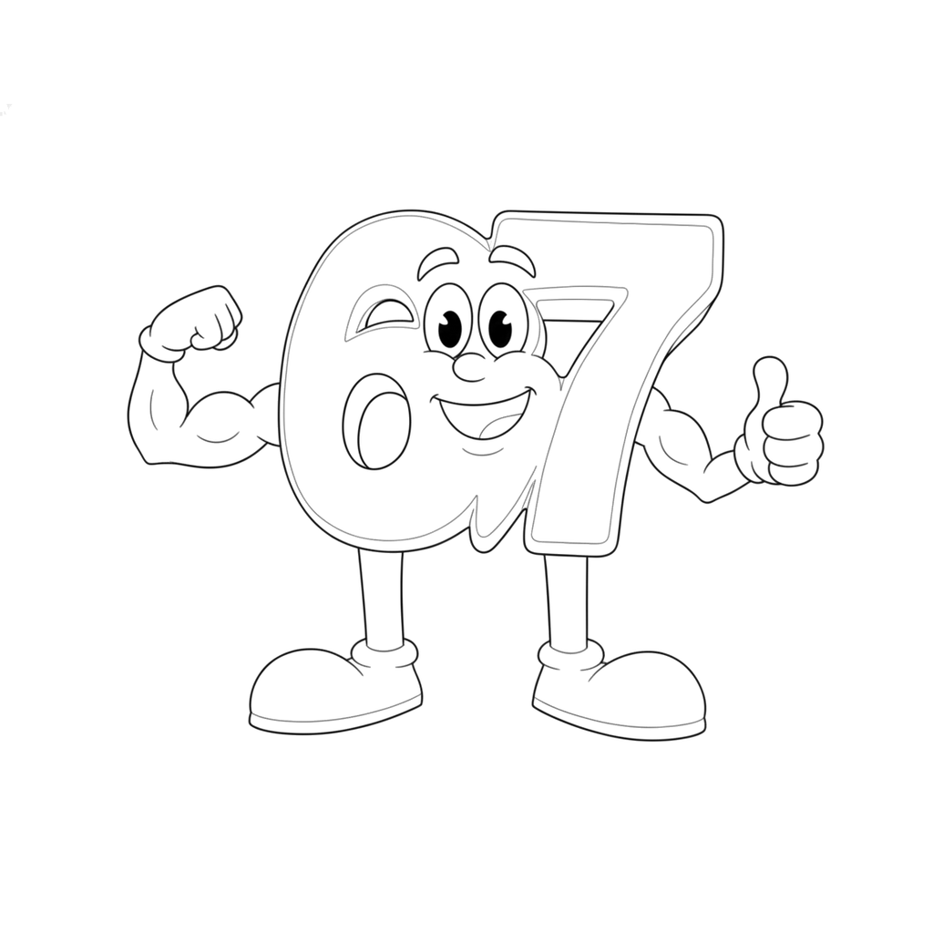 Un alegre personaje de dibujos animados, formado por los números 67, guiña un ojo, flexiona un músculo y levanta el pulgar. Esta divertida mascota numérica irradia confianza y energía positiva.