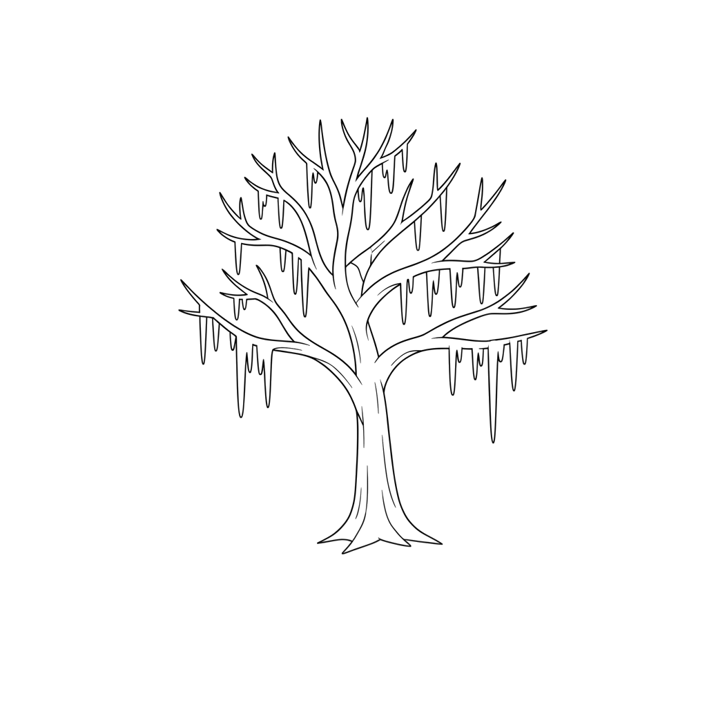 Un hermoso dibujo de un árbol de invierno, con sus ramas desnudas adornadas con muchos carámbanos brillantes. Esta imagen nos recuerda la serena pero impactante belleza de un paisaje frío y helado, perfecto para colorear.