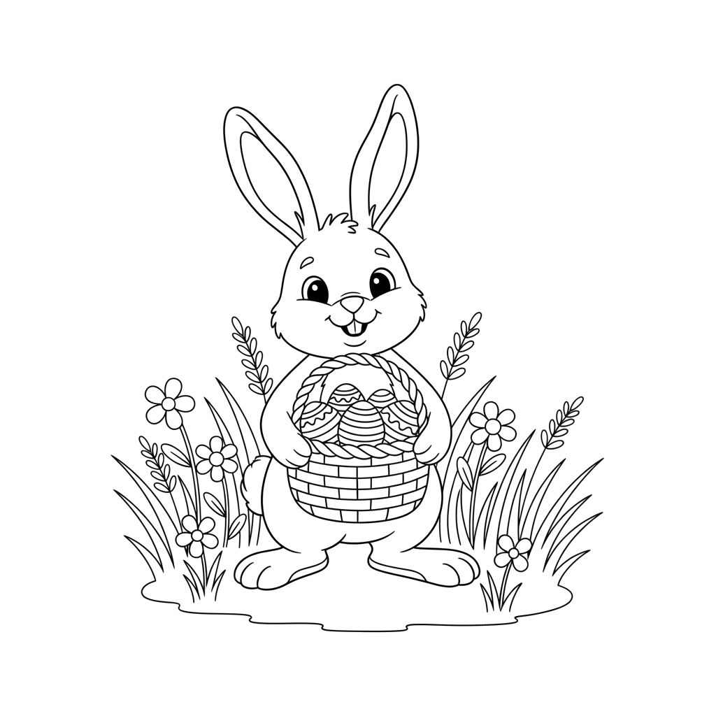 Un conejito alegre sostiene una cesta rebosante de huevos de Pascua decorados, de pie entre flores en flor y hierba alta. Esta adorable escena es perfecta para celebrar la primavera y la festividad de Pascua.