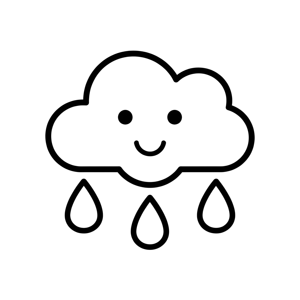 Se muestra un alegre icono de nube con una cara sonriente y tres grandes gotas de lluvia cayendo de ella. Este sencillo dibujo en blanco y negro es perfecto para una actividad temática sobre el clima.