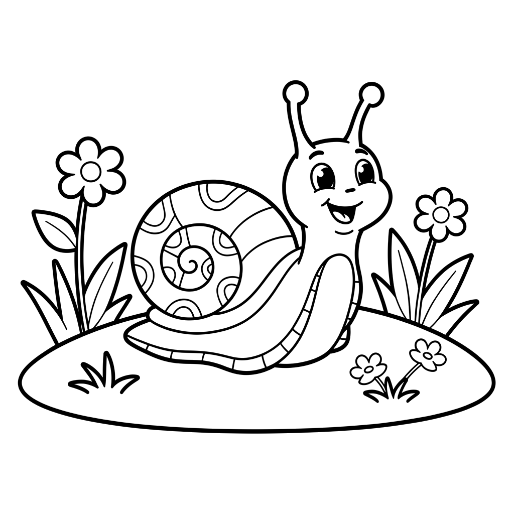 Un caracol alegre con una concha decorativa se sienta felizmente en un montículo de hierba rodeado de flores en flor. Esta amigable escena invita a la creatividad y la imaginación.