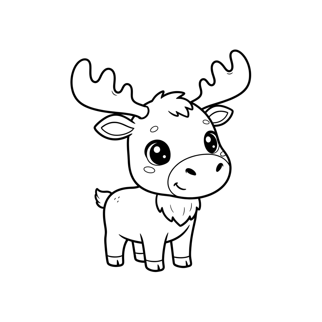 Un alce bebé súper adorable se yergue con sus grandes astas, luciendo una expresión amigable y ojos grandes y expresivos. Esta encantadora criatura está lista para cobrar vida con colores vibrantes.