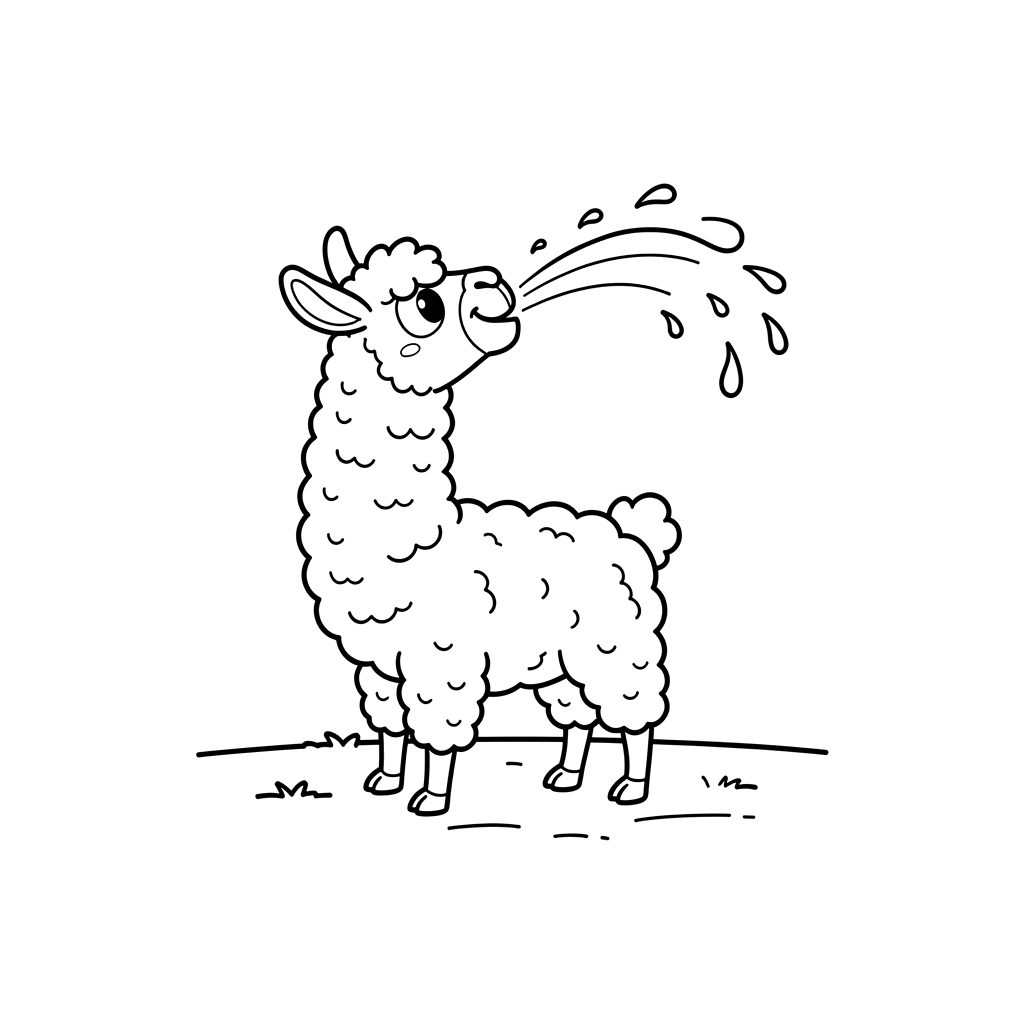 Una llama encantadora y esponjosa se para en un trozo de césped, escupiendo humorísticamente un chorro de líquido. Esta adorable escena captura la naturaleza juguetona del animal.