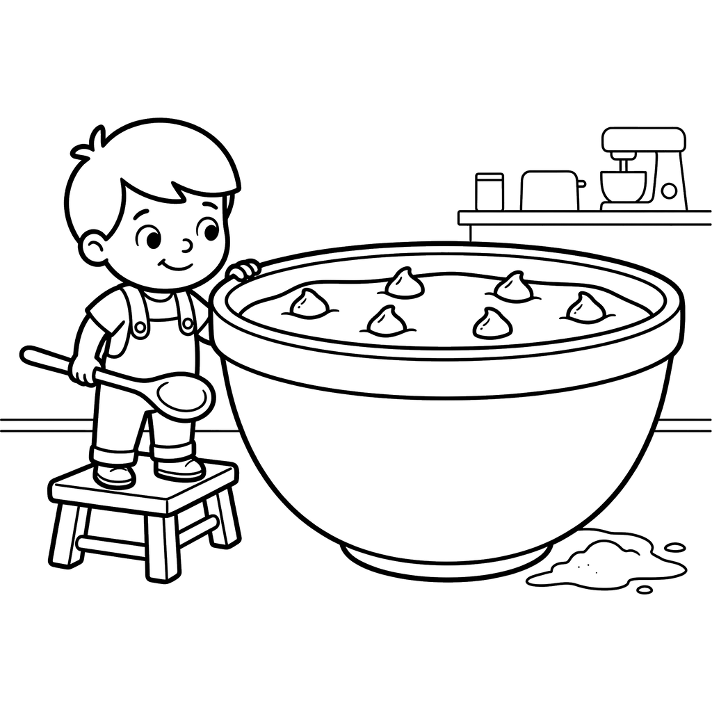 Un jeune garçon joyeux, debout sur un tabouret, prépare avec enthousiasme une recette dans un grand saladier, impatient de cuisiner de délicieuses gâteries. Il est prêt à remuer la pâte, qui contient déjà des gouttes intrigantes, peut-être des pépites de chocolat.