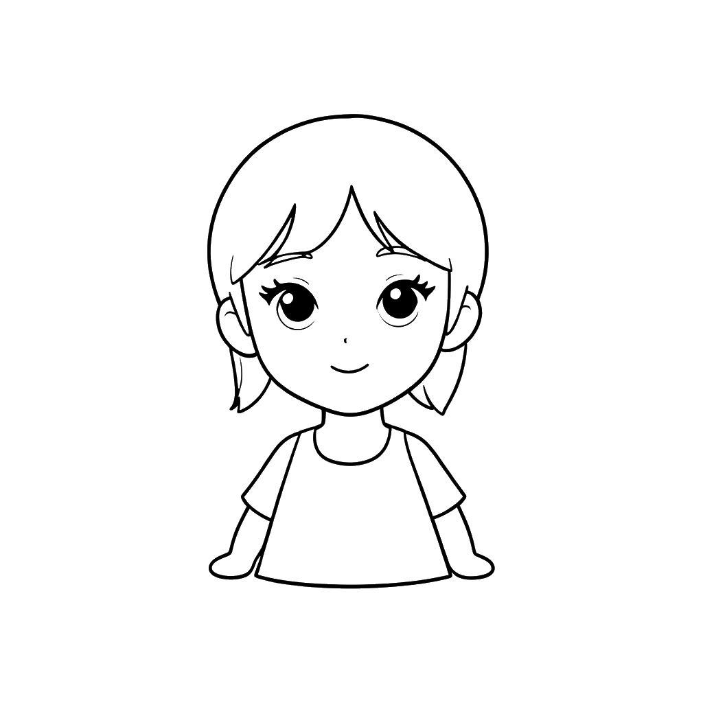 Un dessin charmant et doux d'une jeune fille à l'expression joyeuse, parfait pour une activité d'enfant. Elle a les cheveux courts, de grands yeux et un sourire doux, ce qui la rend très accessible.