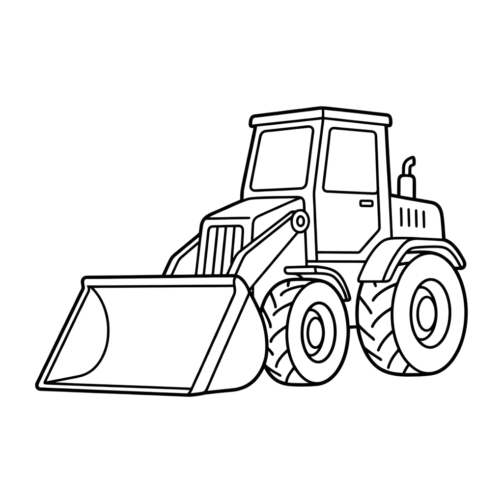 Un dessin clair d'une puissante chargeuse frontale, essentielle pour les travaux de construction lourds. Ce véhicule robuste est parfait pour déplacer la terre et les matériaux avec son grand godet avant.