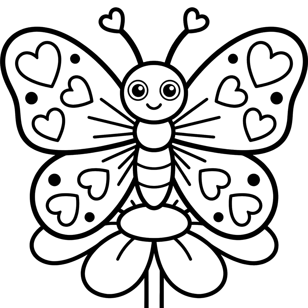 Un papillon joyeux orné de cœurs sur ses ailes et ses antennes sourit vivement en se posant délicatement sur une fleur épanouie. Cet insecte adorable apporte une touche d'amour et de joie à n'importe quelle scène.