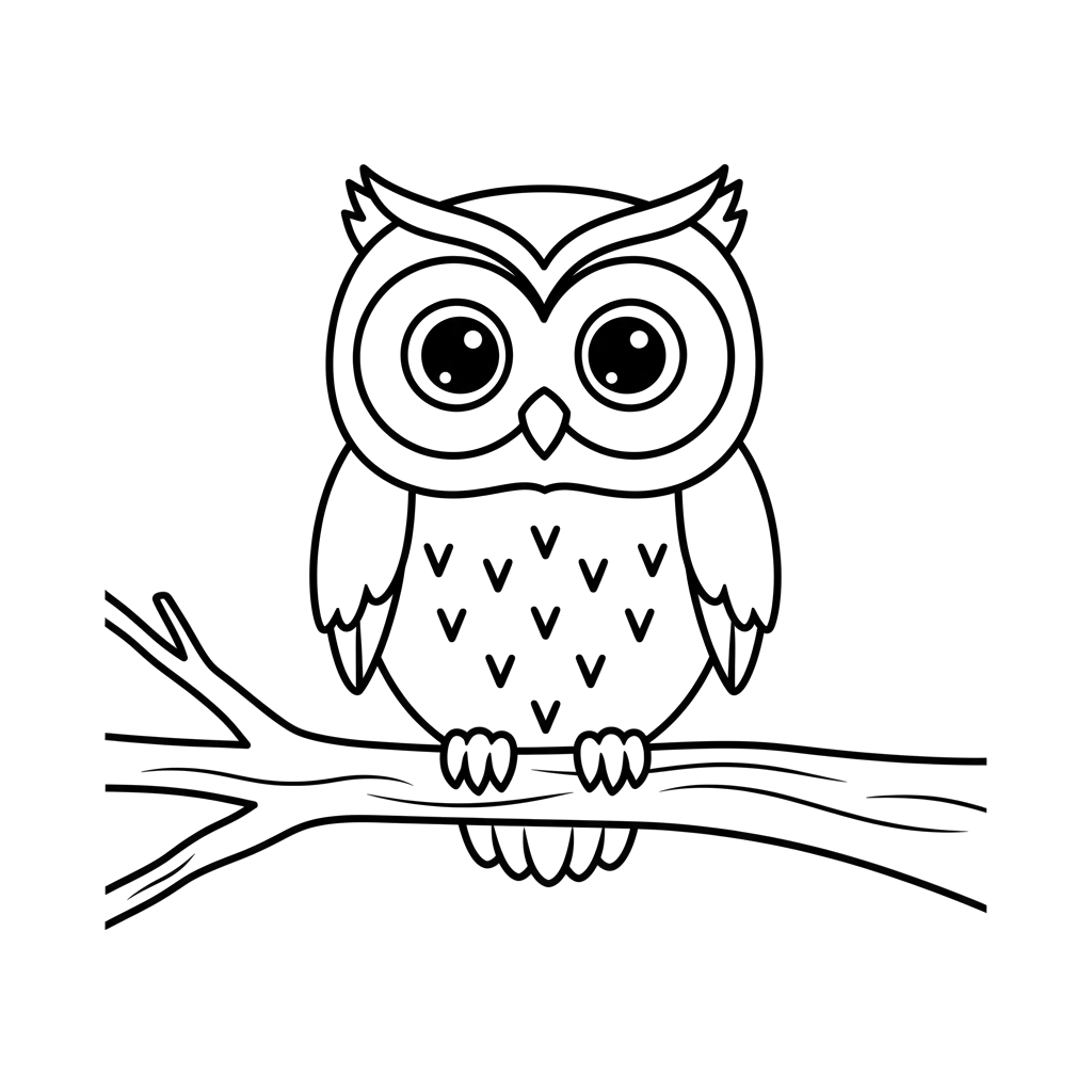 Un hibou doux aux grands yeux avec des aigrettes distinctes se perche calmement sur une solide branche d'arbre. Cet oiseau amical est prêt pour un coloriage créatif.