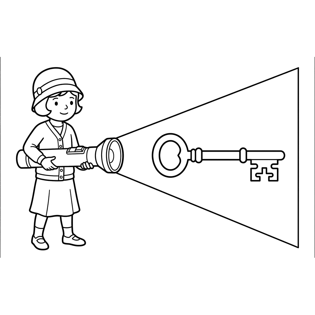 Une jeune fille, vêtue d'un chapeau élégant et d'une jupe, éclaire avec une grande lampe de poche pour révéler une clé ornée et ancienne. Cette image capture un moment de découverte, parfait pour une petite aventurière.