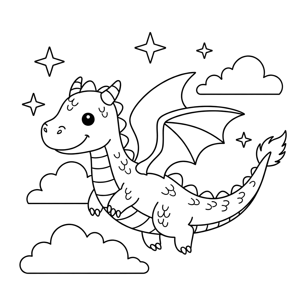 Un dragon amical aux grandes ailes sourit en s'envolant dans le ciel parmi des nuages moelleux et des étoiles scintillantes. Cette charmante créature est prête à prendre vie avec des couleurs vives.