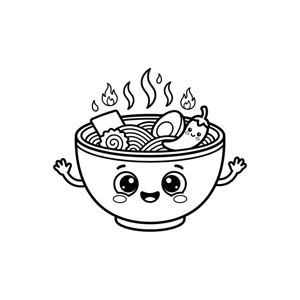 Semangkuk ramen kawaii yang menggemaskan dengan wajah ceria melambai halo, melimpah dengan mi, telur, narutomaki, rumput laut, dan cabai merah yang bahagia. Uap dan api mengepul dari hidangan panas dan pedas ini, siap untuk pengalaman mewarnai yang menyenangkan.
