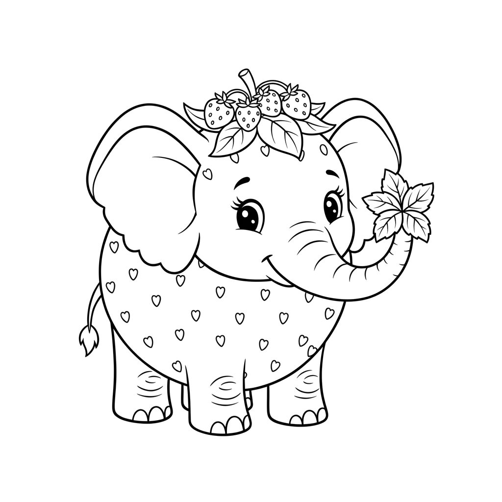Seekor bayi gajah yang menggemaskan dihiasi mahkota stroberi dan pola hati yang manis di tubuhnya, dengan lucu memegang tangkai berdaun dengan belalainya. Hewan yang manis ini sangat cocok untuk diwarnai secara kreatif.