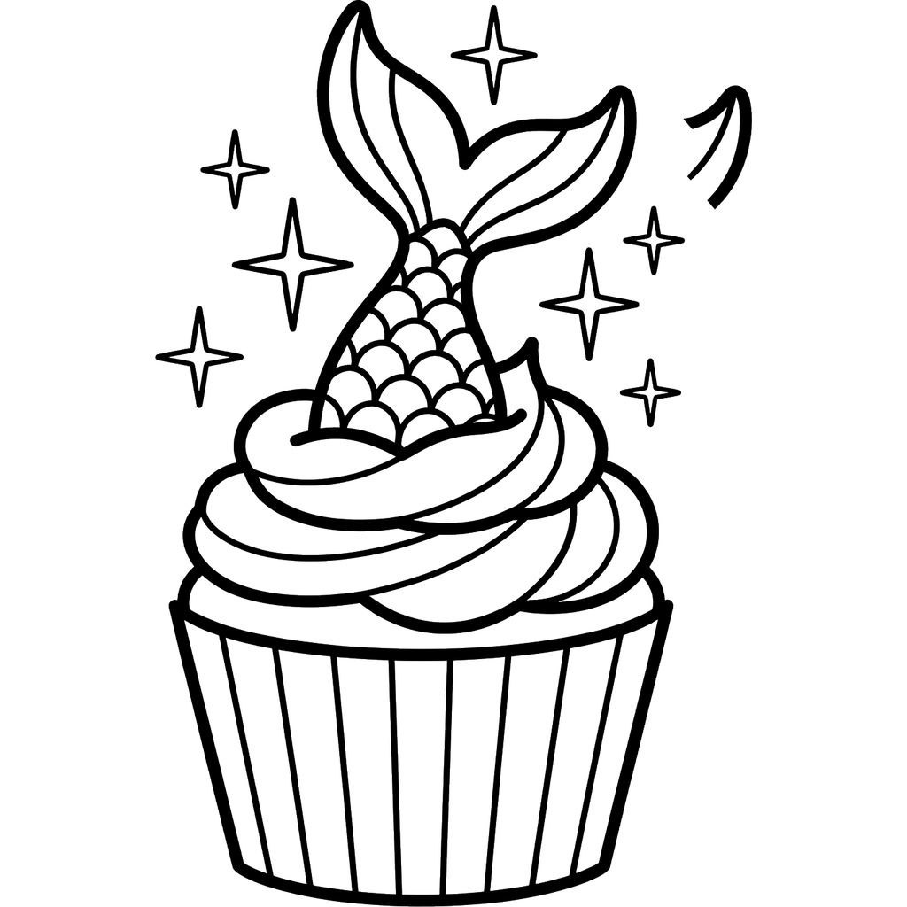 Sebuah cupcake yang menggemaskan dihiasi dengan ekor putri duyung yang detail muncul dari frosting berputar, dikelilingi oleh bintang-bintang berkilau. Hidangan penutup yang mempesona ini memadukan fantasi ajaib dengan camilan manis.