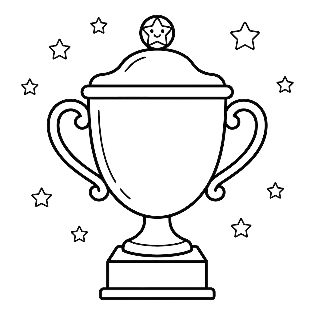 Sebuah piala trofi megah, lengkap dengan tutup perayaan yang dihiasi bintang ceria, dikelilingi oleh banyak bintang berkilauan, siap untuk semburan warna pemenang.