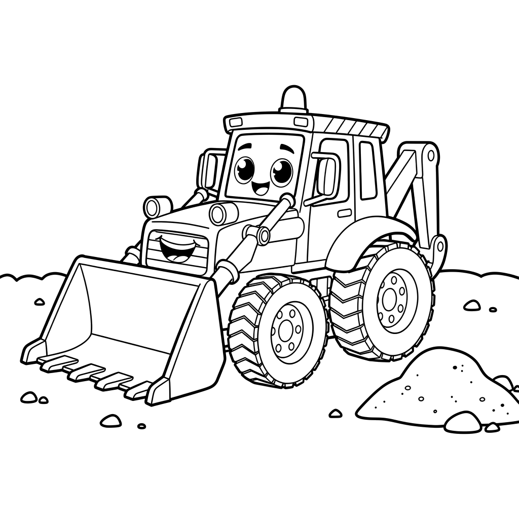 Sebuah backhoe loader ramah dengan senyum lebar siap untuk keseruan menggali, duduk di sepetak tanah di samping tumpukan kecil tanah. Kendaraan konstruksi yang ceria ini sangat cocok untuk penggemar muda.