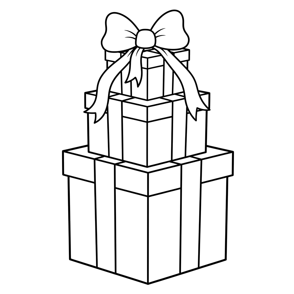 Garis besar yang menyenangkan ini menampilkan tumpukan tiga kotak hadiah yang terbungkus indah, dihiasi dengan pita elegan. Siap untuk kamu warnai dan hidupkan dengan nuansa meriah.