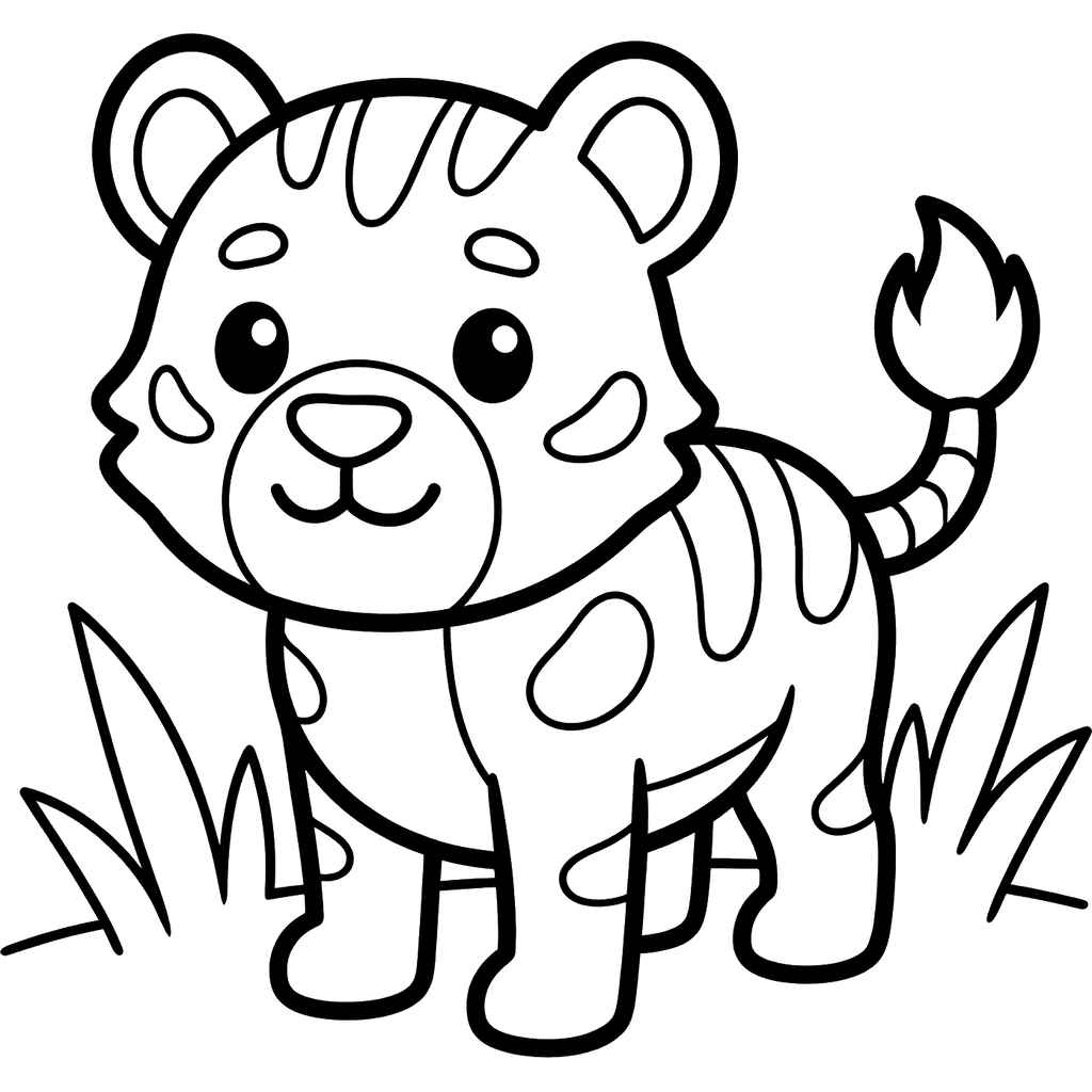 Seekor anak harimau manis dengan ekspresi ramah berdiri dengan riang di rerumputan tinggi. Fitur imutnya dan garis-garis khasnya siap dihidupkan dengan warna.