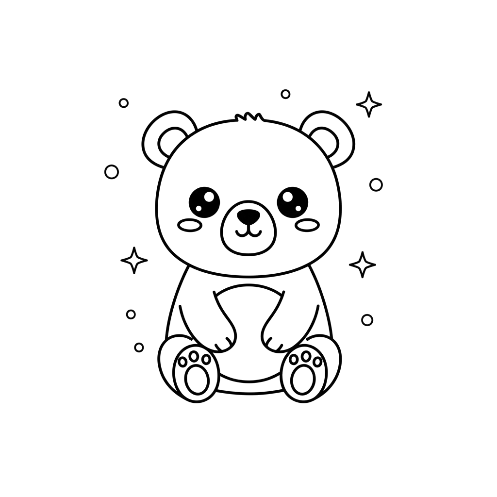 Gambar menawan ini menampilkan beruang bayi yang menggemaskan dengan mata besar ekspresif dan senyum manis, dikelilingi oleh bintang-bintang berkelip dan lingkaran-lingkaran halus. Ini adalah desain yang menyenangkan, siap untuk dipersonalisasi dengan warna-warna cerah.