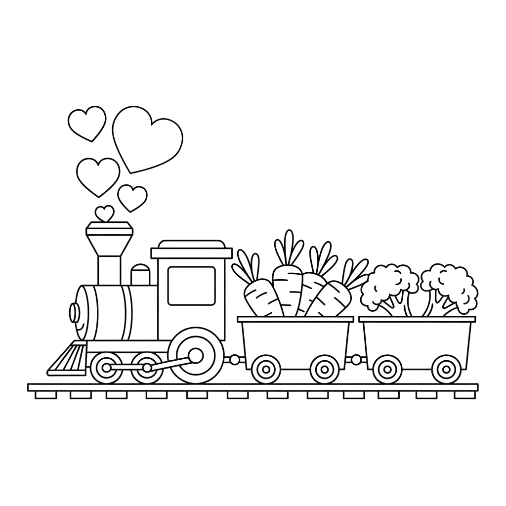 Un grazioso treno procede sbuffando, trasportando un delizioso carico di carote fresche e broccoli. Cuori escono dal suo fumaiolo, aggiungendo un tocco di affetto a questa scena di trasporto sano.