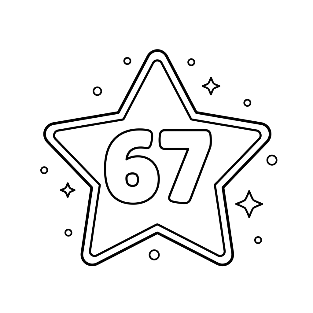 Un design stellare celebrativo con il numero sessantasette, impreziosito da scintille e puntini. È una grafica ideale per celebrare traguardi o esercitarsi nel riconoscimento dei numeri.