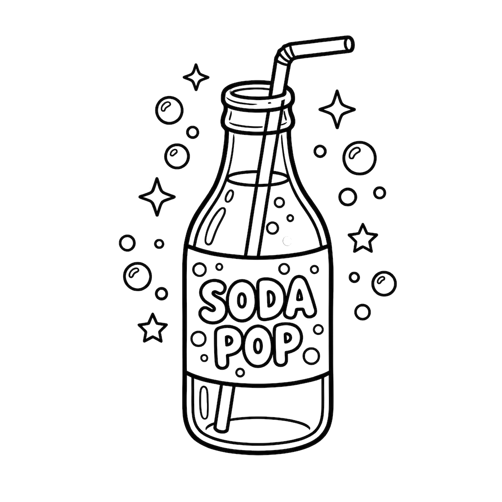 Questa divertente immagine mostra una classica bottiglia di bibita con una cannuccia, circondata da bolle giocose e stelle scintillanti. È una rappresentazione stravagante di una bevanda frizzante e rinfrescante.