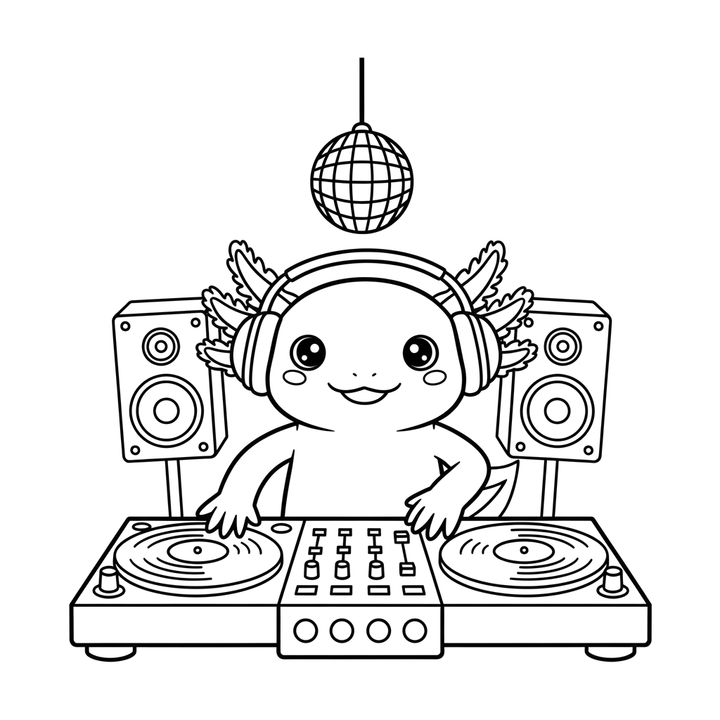 Un allegro axolotl DJ è pronto a far girare i dischi, completo di cuffie, un impianto di mixaggio completo, altoparlanti e una scintillante palla da discoteca. Questo adorabile anfibio è pronto a fare un figurone alla festa.
